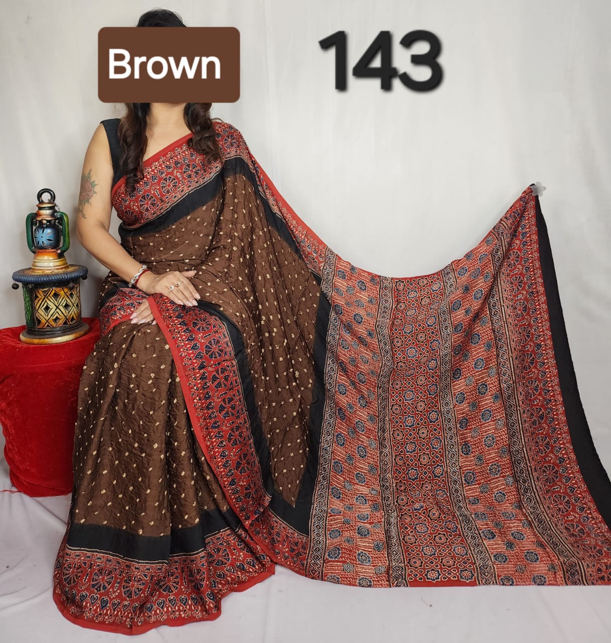 Experience timeless elegance with this modal silk saree adorned with authentic Ajrakh handblock prints, meticulously crafted by skilled weavers. Its smooth texture and intricate patterns bring a refined charm, perfect for those who appreciate artisanal heritage fused with modern sophistication. Ideal for special occasions or graceful everyday wear.